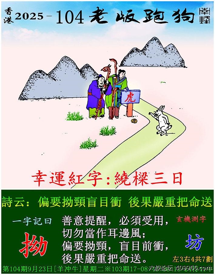 104期老版跑狗一字記之曰:【拗】 詩雲:偏要拗頸盲目衝,後果嚴重把命送。