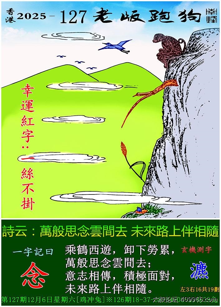 127期老版跑狗一字記之曰:【念】 詩雲:萬般思念雲間去,未來路上伴相隨。