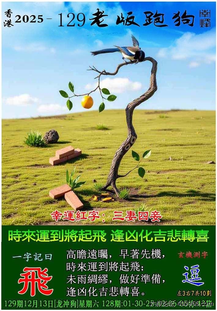 129期老版跑狗一字記之曰:【飛】 詩雲:時來運到將起飛,逢凶化吉悲轉喜。