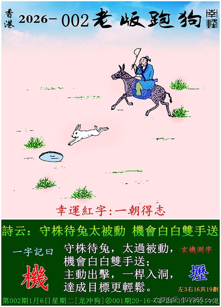 002期老版跑狗一字記之曰:【機】 詩雲:守株待兔太被動,機會白白雙手送。