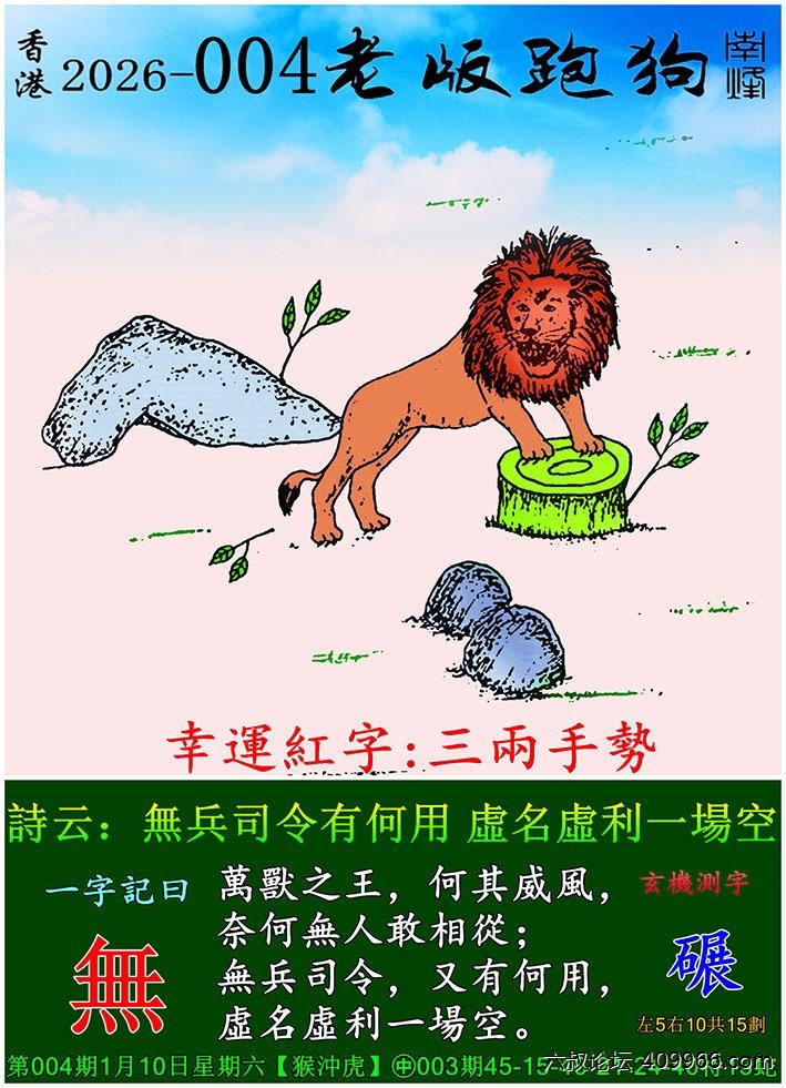 004期老版跑狗一字記之曰:【無】 詩雲:吳兵司令有何用 虛名虛益一場空。