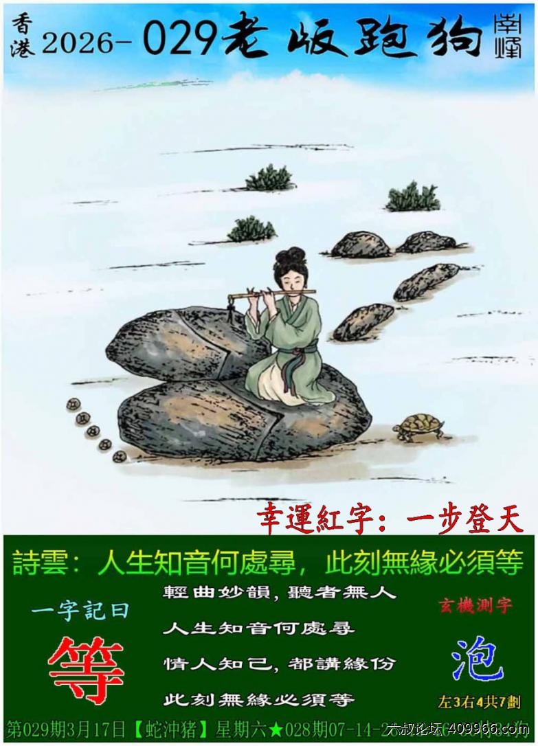 029期老版跑狗一字記之曰:【等】 詩云:人生知音何處尋,此刻無緣必須等。