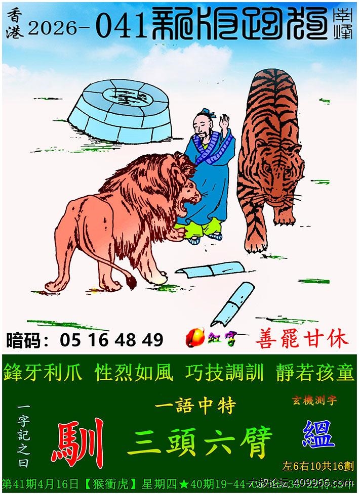 041期新版跑狗一字記之曰:【馴】 玄機測字:《縕》 一語中特:三頭六臂