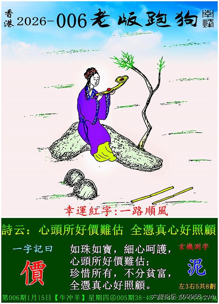 006期老版跑狗一字記之曰:【價】 詩雲:心頭所好價難估,全憑真心好照顧。