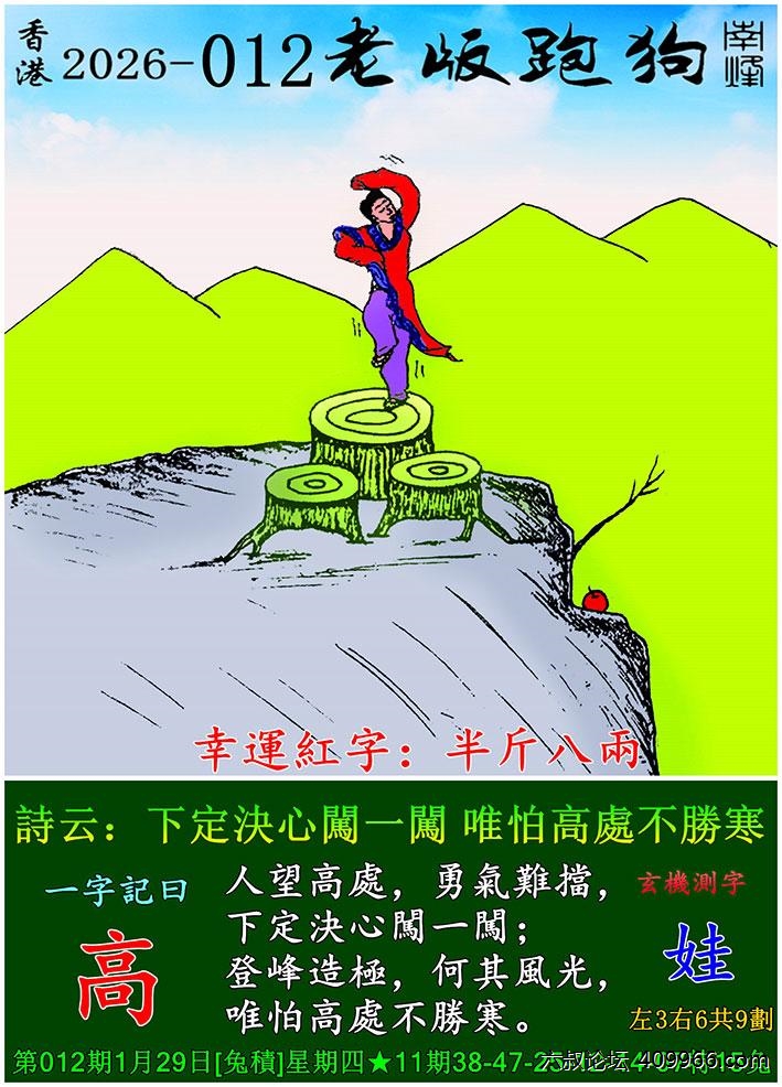 012期老版跑狗一字記之曰:【高】 詩雲:下定決心闖一闖,唯怕高處不勝寒。