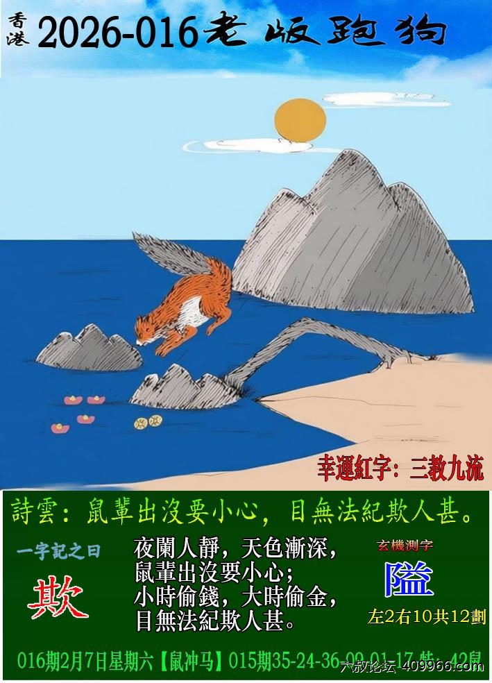 016期老版跑狗一字記之曰:【欺】 詩雲:鼠輩出沒要小心,目無法紀欺人甚。