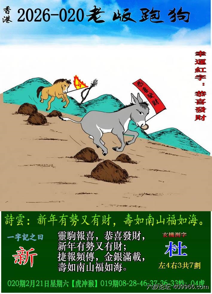 020期老版跑狗一字記之曰:【新】 詩雲:新年有勢又有財,壽如南山福如海。