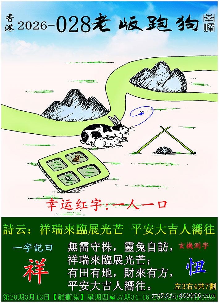 028期老版跑狗一字記之曰:【祥】 詩雲:祥瑞來臨展光芒,平安大吉人嚮往。